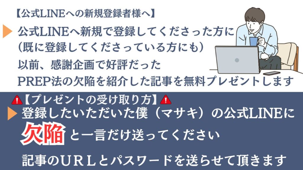 公式LINEに登録してくれた人には、PREP法が持つ「前提の共有が肝心」なんてことより、もっと深刻なPREP法の欠陥を伝える記事をプレゼントすることにしよう。